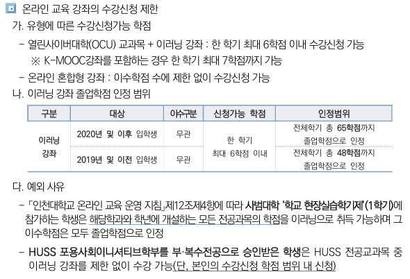 온라인 강좌 증가, 융복합 교육 확대 등의 사유로 「인천대학교 온라인 교육 운영 지침」 제12조(이러닝 강좌 학점 취득) 개정에 따라